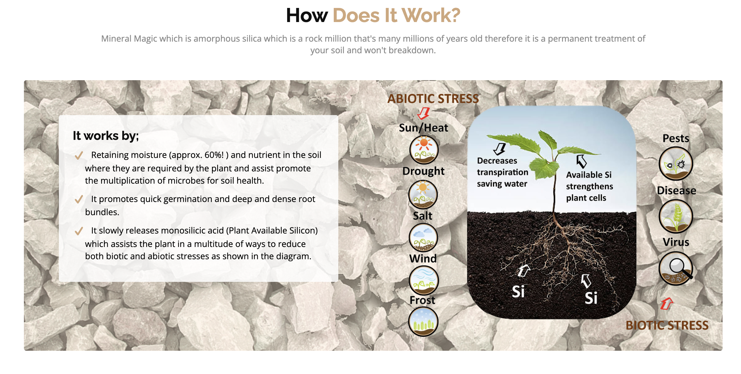 Mineral Magic is made from Biogenic Amosphous Silica (BAS) sourced from the Pilbara in Western Australia.
